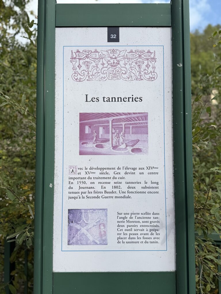 La dernière tannerie de Gex fonctionne jusqu’à la crise de 1929. En 1893, elle traite des cuirs forts et mous et possède un marteau, actionné par la force hydraulique, pour frapper les cuirs.