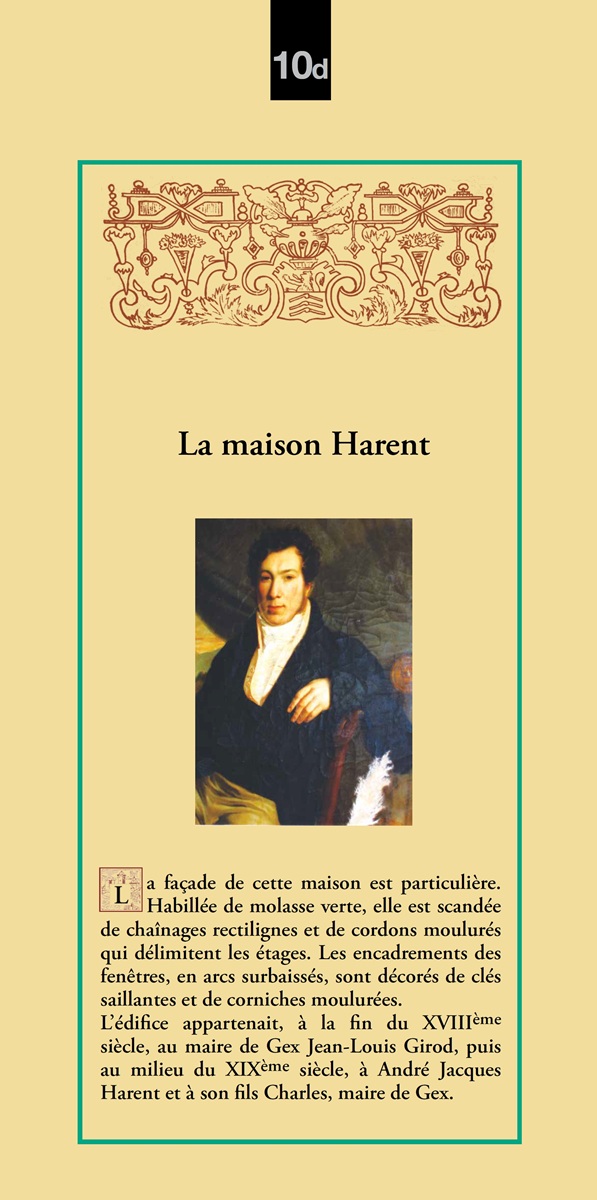 L’édifice appartenait, à la fin du XVIIIème siècle, au maire de Gex Jean-Louis Girod, puis au milieu du XIXème siècle, à André Jacques Harent et son fils Charles, maire de Gex.